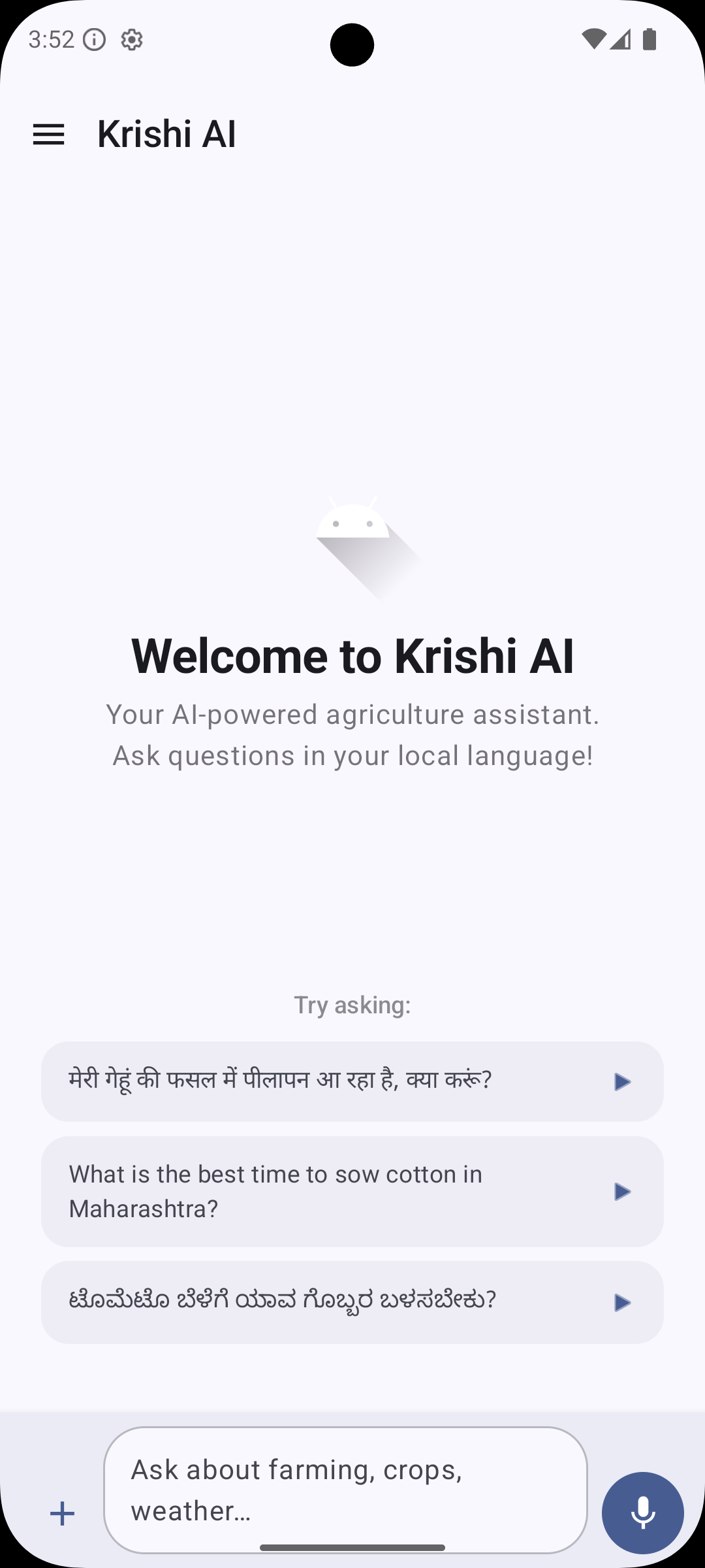 Krishi AI (कृषि AI) helps Indian farmers with AI-powered advice, live market prices, crop disease diagnosis, and more — all in your language.
